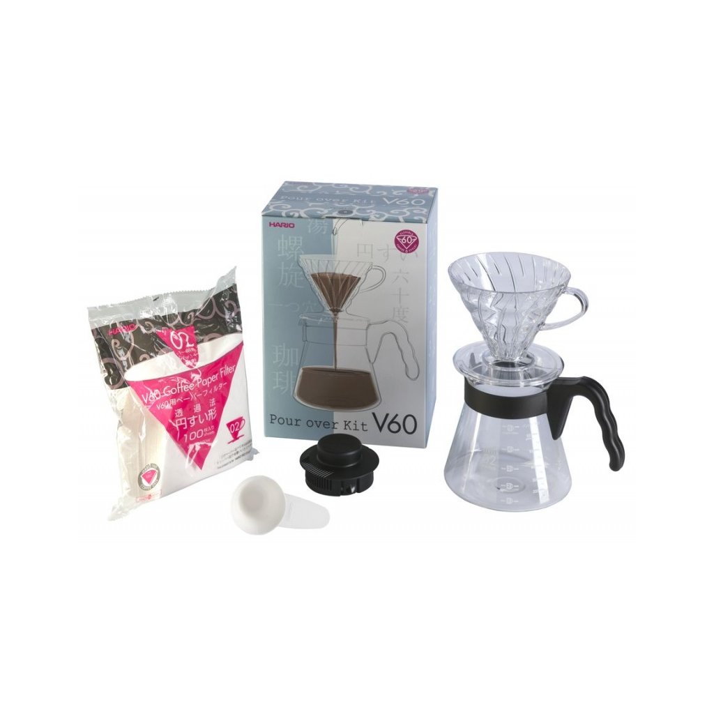 Součástí sady je legendární dripper Hario V60 v černé plastové verzi (velikost č. 2), skleněná konvička a balíček bělených papírových filtrů.